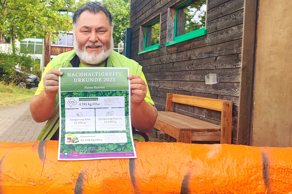Wir haben für 2023 eine Nachhaltigkeits-Urkunde bekommen, was wir alleine dort an CO2 einsparen. Und die hat es in sich: