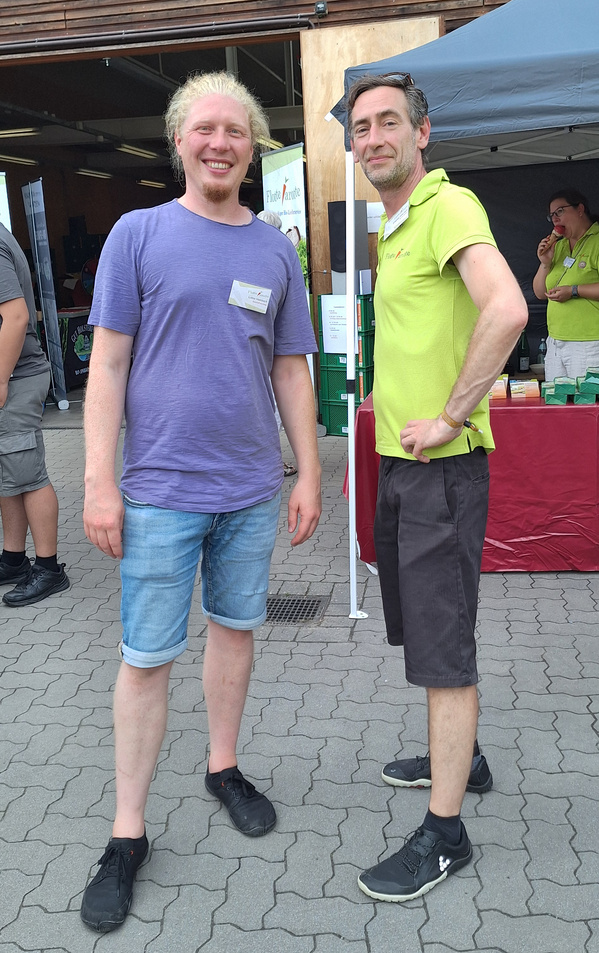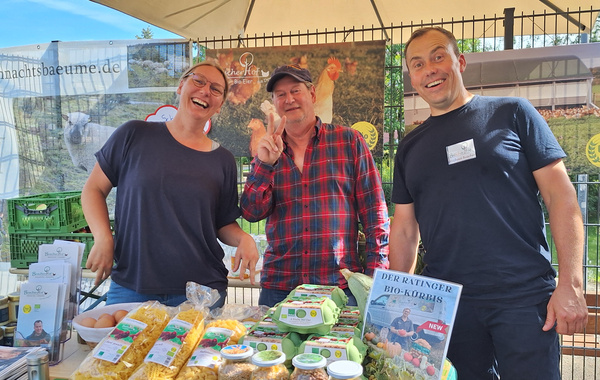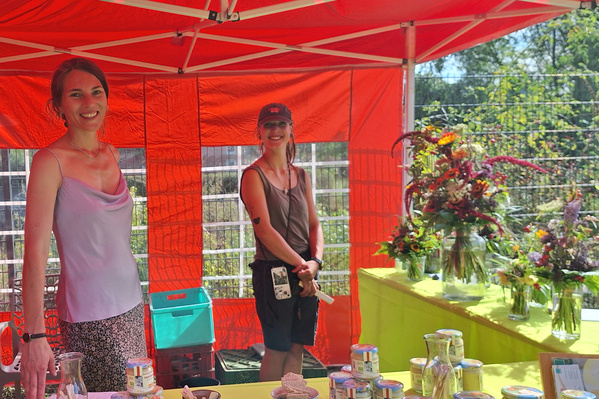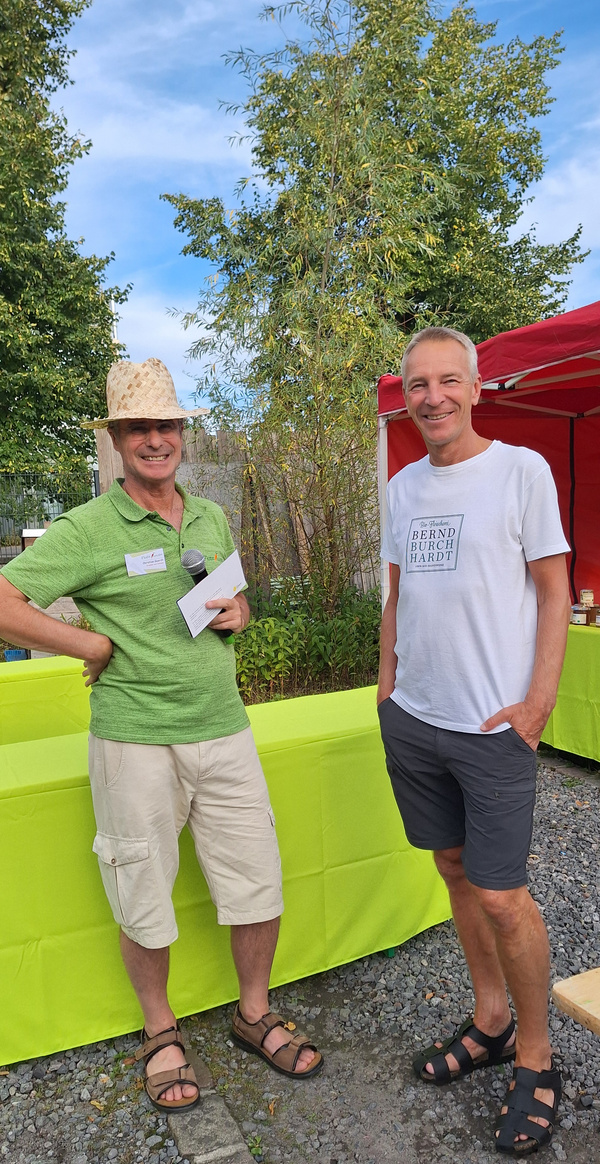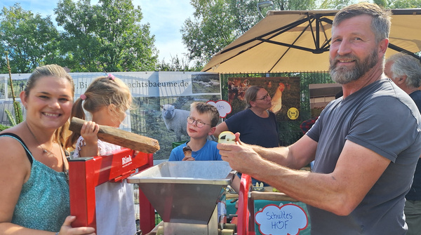 Eva und Sevim von Back Bord präsentierten eine große Auswahl an Backwaren. Sarah vom Gut Holsterfeld versüßte uns mit köstlichem Erdbeerkuchen und Erdbeermarmelade den Tag. Heiner vom Schulte’s Hof war mit einer Apfelpresse vor Ort, und seine mitgebrachten Äpfel wurden vor allem von den jüngeren Besuchern ordentlich in die Mangel genommen. Torben und Klaus von der Bio-Fleischerei Burchhardt grillten fleißig Brat- und Currywürste und Kim vom Klosterberghof präsentierte ihr neuestes Schnittblumen-Projekt, von dem wir bald noch mehr hören, sehen und vor allem riechen werden. Passend dazu präsentierte Christine nebenan feinsten Honig von Meisterhonig. Michael Buscher vom Buscher Hof brachte überraschenderweise die ersten Kürbisse mit. Bert vom Trantenrother Hof brachte eine Auswahl seines köstlichen Gemüses mit und Stephan Lüdenbach aus dem Bergischen Land bot jedem die Gelegenheit, sich ausführlich über seinen Gartenbaubetrieb zu informieren. Von ihm beziehen wir jedes Jahr die tollen Nordmann-Tannen – ab Oktober startet bei uns im Shop die Vorbestellung für die Weihnachtsbäume!