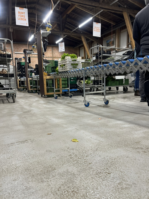 Am Donnerstag hatten wir schon das Rote-Bete-Feld gesehen, Freitag bietet es sich an, die Verarbeitung bei Voelkel zu besichtigen. Die sind mit 420 Mitarbeitenden Marktführer für Bio-Säfte. Schon bei der Anreise duftet alles nach Ingwer, die Shots werden jetzt im Herbst stark nachgefragt. Gut verpackt dürfen wir alles besichtigen, die Kampagne für Äpfel, Karotten und Rote Bete ist in vollem Gange. Es dampft und zischt überall, abgefüllt wird in die verschiedensten Glasflaschen, aber auch in Tetrapacks, wie gerade für dm der Multisaft.
