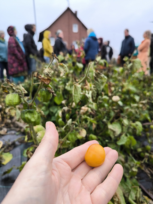 Frühmorgens gehts durchs Wendland mit seinen Anti-Atom-Kreuzen zum Elbershof am Rande der Lüneburger Heide. Hier bewirtschaften Anke und Uli mithilfe von fünf ihrer acht Kinder einen riesigen 280 ha großen Gemischtbetrieb. Wir kommen aus dem Staunen gar nicht mehr heraus, hier gibt es fast alles. Wir plündern auf unserer Rundfahrt zuerst die letzten Physalis, entdecken noch Tomaten, Porree und Salate. Hier kommt alles Gemüse in die grünen Kisten. Hier gibt es die Besonderheit, das morgens geerntet wird und ab mittags erst die Kisten gepackt werden, ganz so frisch schaffen wir es leider nicht. Kompliment!