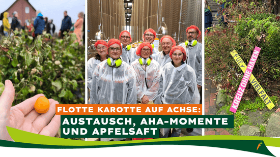 Am Donnerstag hatten wir schon das Rote-Bete-Feld gesehen, Freitag bietet es sich an, die Verarbeitung bei Voelkel zu besichtigen. Die sind mit 420 Mitarbeitenden Marktführer für Bio-Säfte. Schon bei der Anreise duftet alles nach Ingwer, die Shots werden jetzt im Herbst stark nachgefragt. Gut verpackt dürfen wir alles besichtigen, die Kampagne für Äpfel, Karotten und Rote Bete ist in vollem Gange. Es dampft und zischt überall, abgefüllt wird in die verschiedensten Glasflaschen, aber auch in Tetrapacks, wie gerade für dm der Multisaft.