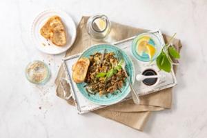 Algen** (31%), Lauch* (18%), Karotten* (16%), Sojasauce* (Wasser, SOJABOHNEN*, WEIZEN*, Meersalz, Koji (Fermentationskultur)), SESAMÖL* (7%), konzentrierter Apfelsaft*, SESAM* (5%), Agavendicksaft*, Meersalz, Ingwer* (<1%), Basilikum*, Branntweinessig*, Peperoni*| Energie | Fett | gesättigte Fettsäuren | Kohlenhydrate | Zucker | Eiweiss | Salz |