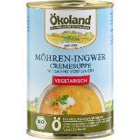 Trinkwasser, 32% Möhren*, Kartoffeln*, 4,5% SCHLAGSAHNE*, SELLERIE*, Zwiebeln*, Reissirup*, Reis*- und Maisstärke*, Sonnenblumenöl*, Meersalz, MILCHPULVER*, Ingwer*, Gewürze* (Macis*, Curcuma*, Pfeffer*, Knoblauch*), Kräuter* (Liebstöckel*, Petersilie*, Rosmarin*).| Energie | Fett | gesättigte Fettsäuren | Kohlenhydrate | Zucker | Ballaststoffe | Eiweiss | Salz |