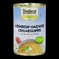 Trinkwasser, 32% Möhren*, Kartoffeln*, 4,5% SCHLAGSAHNE*, SELLERIE*, Zwiebeln*, Reissirup*, Reis*- und Maisstärke*, Sonnenblumenöl*, Meersalz, MILCHPULVER*, Ingwer*, Gewürze* (Macis*, Curcuma*, Pfeffer*, Knoblauch*), Kräuter* (Liebstöckel*, Petersilie*, Rosmarin*).| Energie | Fett | gesättigte Fettsäuren | Kohlenhydrate | Zucker | Ballaststoffe | Eiweiss | Salz |