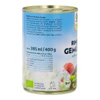 Trinkwasser, 26% Gemüse* - in veränderlichen Gewichtsanteilen (Karotten*, SELLERIE*, Erbsen*, Lauch*, Brechbohnen*), 9% Rindfleisch* gegart, Sonnenblumenöl*, Meersalz, Zuckerrübensirup*, Weinessig*, Traubensaftkonzentrat*, Maisstärke*, Gewürze* (Zwiebeln*, Muskat*, Curcuma*, Pfeffer*, Knoblauch*), Liebstöckel*.| Energie | Fett | gesättigte Fettsäuren | Kohlenhydrate | Zucker | Ballaststoffe | Eiweiss | Salz |